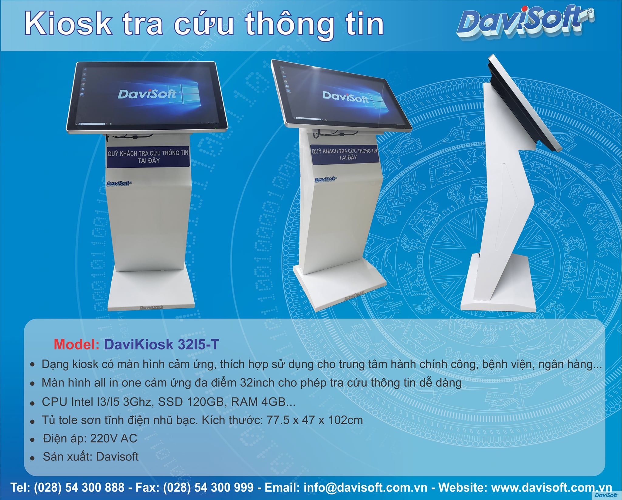 | Chức năng | Tủ Kiosk có màn hình cảm ứng, thích hợp sử dụng cho trung tâm hành chính công, ngân hàng… | |||